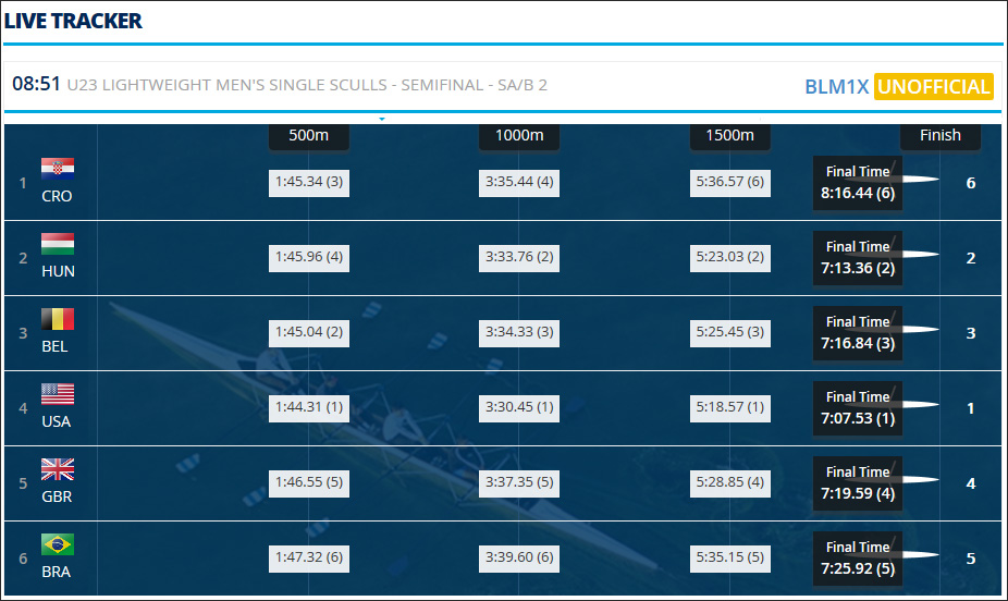 Os 18s39 que separaram o americano Andrew Campbell do brasileiro Uncas Tales na semifinal do Single Skiff Peso-Leve, este sábado, na Itália, marcam a distância entre o atual campeão mundial da prova na categoria Sub-23 e o único dos semifinalistas com idade para disputar o Mundial Júnior, no próximo mês. Com a quinta posição, Uncas rema a Final B este domingo, às 9h37 (4h37 de Brasília), na disputa do 7º ao 12º lugares.
