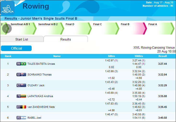 Uncas Tales se despediu com vitória dos Jogos Olímpicos da Juventude, esta quarta-feira, na China. Ele dominou de ponta a ponta a Final B do Single Skiff masculino, e venceu em 3m27s44, terminando em sétimo lugar na classificação geral da competição. Representante do Brasil no feminino, Sophia Câmara ficou em quinto na Final C, com a 17ª posição no Single Skiff.